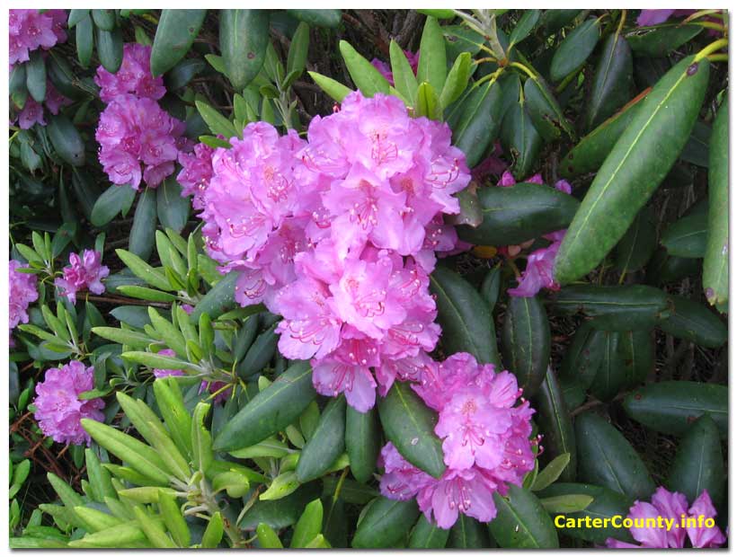 Many people visit Roan Mountain to see the brilliant expanse of purple pink Catawba rhododendron blooms around the third week in June. This species of rhododendron is found in clumps along some higher peaks of the Appalachians including the Blue Ridge. Catawba rhododendron thrive here on the highlands of the Roan massif. Besides the rhododendron gardens at the top, they grow scattered around the mountainside and along the balds. The more common pink-white rosebay rhododendron is also found on the Roan, throughout the surrounding mountains, and in Roan Mountain State Park at the base of the mountain. A rhododendron festival is held to coincide with the expected peak time for the big pink Catawba flowers. The rhododendron bloom of Roan Mountain was featured in an article in the June 1957 issue of National Geographic. The mountain in full bloom has a surreal beauty beyond description.