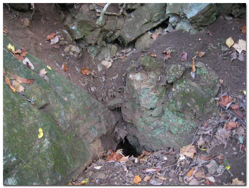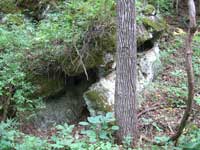 The trail starts out level for some distance. Rocks filled with holes appear along the left of the trail. This mountain side contains a network of caverns. At some of the holes along the trail, cool cave air spills out. Take a moment to feel some pure mountain natural air conditioning. Then we move onward through the Tennessee summer.