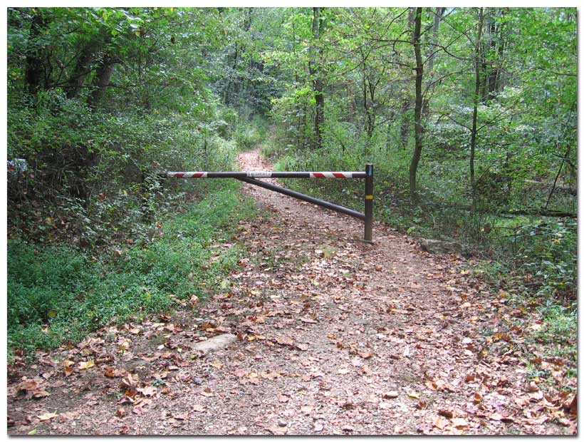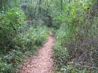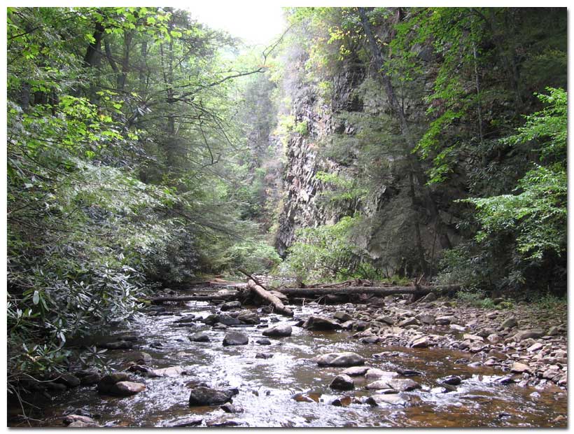 After walking the the first flat trail section, you come upon an incline. After getting up the hill, the path turns rocky and crosses a power line right of way. Shortly there is a fork. In this case, the upper fork is a shortcut and the right one leads down to the creek. We take the path down and walk along the water. There is a high rock wall where the stream has made some pools and small beaches. It's a good spot for a picture or two, maybe stop and soak the feet here on the return. We can't linger as there is a long way to go yet. We hike past large eastern hemlocks, rhododendron, sycamore trees and a wide range of Appalachian plant life.