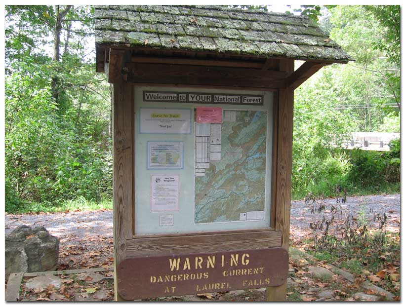 Let's take a hike! We are going from the Hampton trailhead to Laurel Falls and back. It's a sunny September day. There has been a period of drought this summer so the trail should be dry and the bugs few. Since it has been so dry the stream water levels are lower than usual. In times of snow melt or high precipitation Laurel Fork has the potential for rapid flooding. The weather looks fine today. It should be a good day to walk. We have a small backpack with water, a few snacks, basic first aid items, and a camera. We have a cell phone but it may not work in many of the places we'll be. We take heed of the warnings at the trail info sign. Avoid getting in the water below the falls and climbing on the falls. There have been fatalities there.