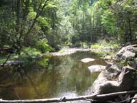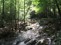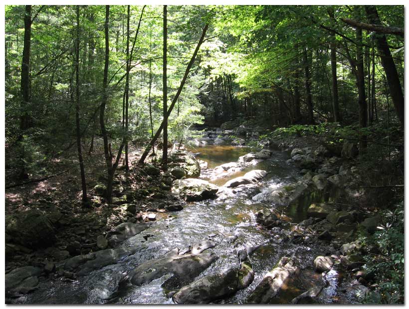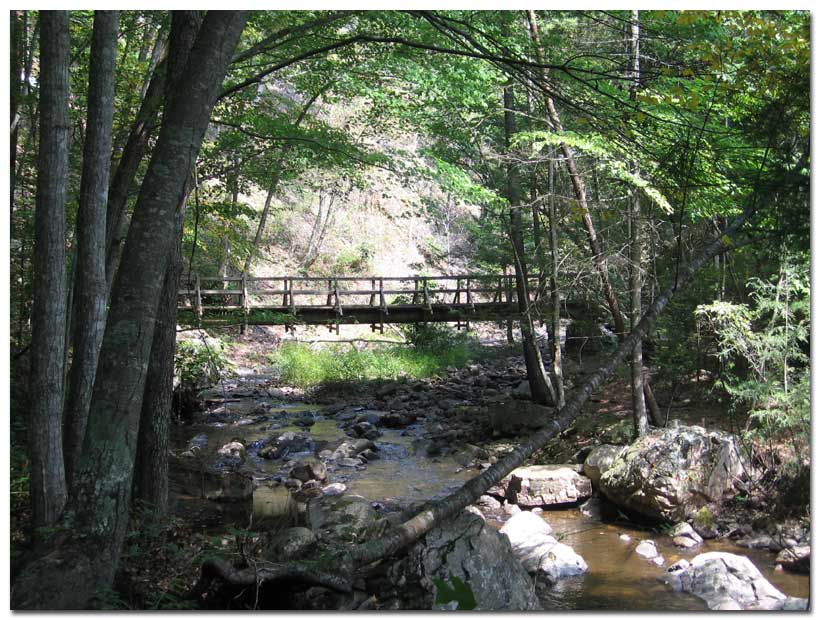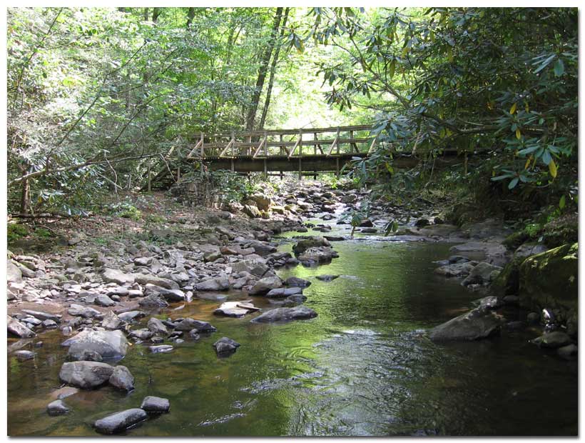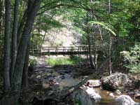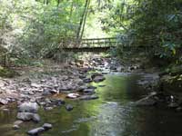 After a stretch along this side, it is time to cross back over on the second bridge. One of the common features of creek hikes in the Appalachians are frequent water crossings. Some of the trails in the Smoky Mountains have numerous places to ford creeks. The bridges make this trail much easier in that respect. It's almost civilized. Let's not get too complacent though. There'll be plenty of opportunities ahead to avoid serious injury.