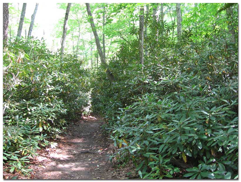 The trail runs mostly level through a green world of rosebay rhododendron. In this lush place they grow large. It's no wonder the pioneers called these dense patches hells. Imagine trying to walk through that without a trail. They bloom earlier in the summer with large slightly pink white flowers.