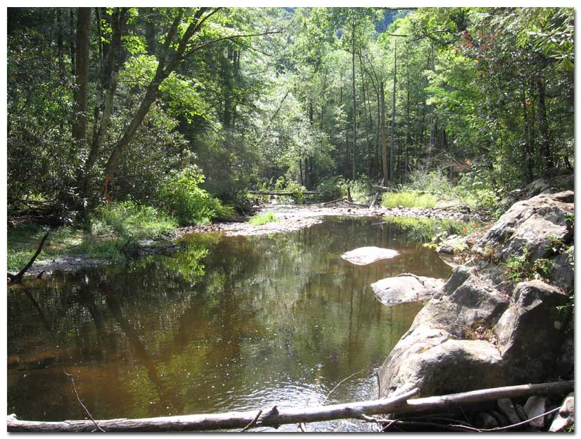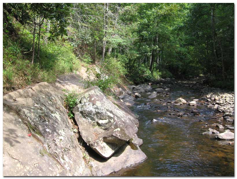 We start this part of the hike walking on a narrow rock ledge. This is a slightly tricky section of the trail. It's an easy place to lose a pet or person so we pick our way across carefully. The path becomes nice and flat again while we cruise past rocks and water. Pools of calm water form in natural hollows and beaver ponds. Trout inhabit the waters of Laurel Fork. Far upstream beyond the Dennis Cove campground special trout fishing rules apply. Search "trout regulations" for this stream at the TWRA site for details. We aren't fly fishing today so we walk on.