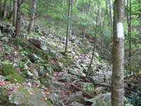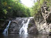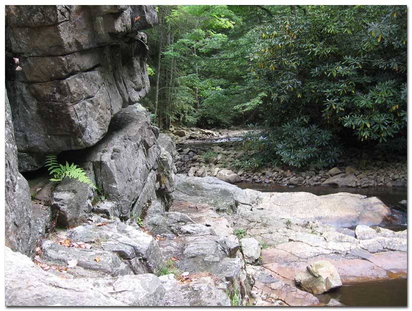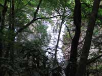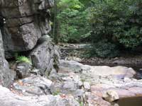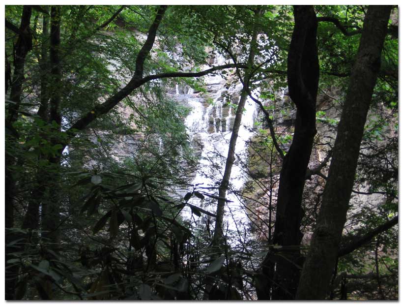 We're nearing the waterfall now. The trail becomes solid rock in places. High rock walls run along the path. It wouldn't be a good time to twist an ankle. We are deep in the forest now. Often when hiking to a waterfall in the Appalachians, the sound of falling water is heard before it's seen. Trees and other plant life thrive in the moist environment surrounding waterfalls. The lush green foliage obscures the view.